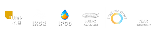Excellent UGR glare control with set back optical design, 60° beam optic as standard
