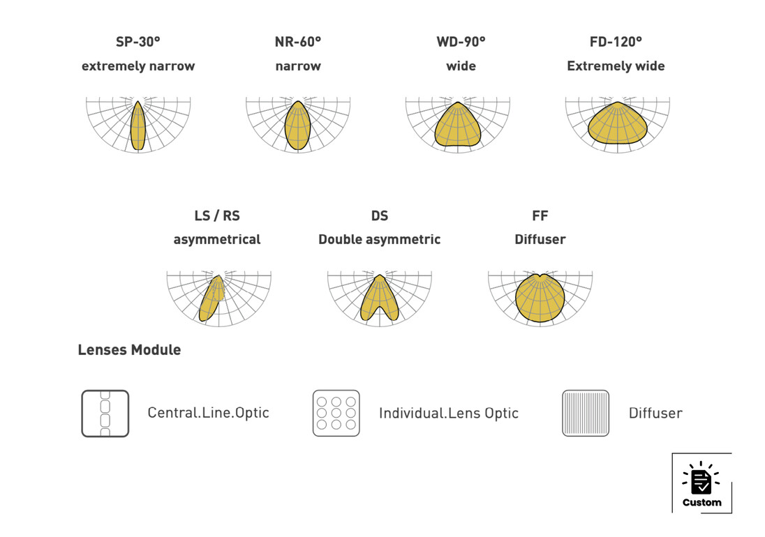 Tailored optics and light distribution — With interchangeable lenses and beam angles (sharp, narrow, wide, flood, asymmetric, double-asymmetric, diffused, and more), plus a wide colour temperature range (2700K – 6500 K), you can dial in the perfect light for any environment, from warm, inviting retail zones to bright task-oriented warehouses